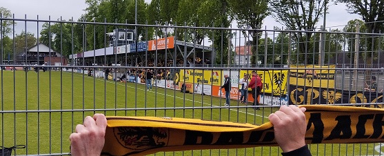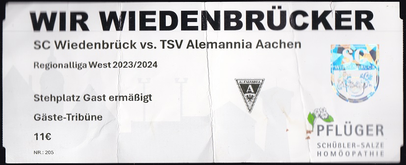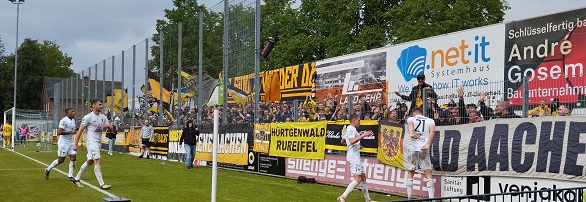 Nach dem feststehenden Aufstieg ging es noch zum zehnten und vorerst letzten Mal nach Wiedenbrück. Hier zeigte man sich sehr gastfreundlich, erweiterte den Gästebereich, stand für unsere Mannschaft Spalier und spielte dabei noch ein Alemannia-Lied. Auch auf dem Platz zeigte man sich eher großzügig. Nach einem unnötigen Foul an Heinz traf letzterer vom Punkz zum 0:1. Nach Freistoß von Heinz landete der Ball bei Scepanik, der zum 0:2 traf. Heinz traf in der zweiten Halbzeit noch zweimal, als er zum 0:3 von rechts nach innen zog und zum 0:4 einen perfekten langen Pass von Brasnic verwertete. "Nur ein Jahr, dann sind wir wieder da!" Oder so.