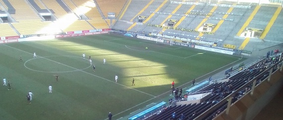 auf der Haupttribüne verteilten. Bei der Alemannia war erstmals