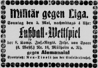 * Da dieses Freundschaftsspiel bereits vereinbart war, trat die Alemannia zum Nachholspiel in der Liga beim Düsseldorfer FC 1899 nicht an, wodurch dieser die Klasse hielt und der VfvB Ruhrort abstieg.