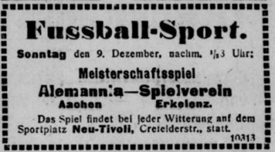 * Das Spiel wurde zunächst für Erkelenz gewertet, da die Alemannia fünf Minuten zu spät angetreten war; nach Einspruch der Alemannia blieb das ursprüngliche Ergebnis bestehen.