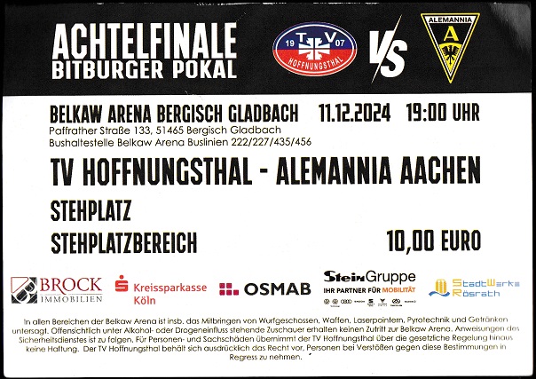 Der gefühlt 732. verpasste Ground im Mittelrheinpokal war die schön gelegene Anlage des Bezirksligisten TV Hoffnungsthal. Stattdessen wurde zum gefühlt 157. Mal in Bergisch Gladbach gespielt. Die Alemannia tat das mit einer auf dem Papier deutlich besser besetzten Elf als in der ersten Runde gegen Horrem. Trotzdem sah man erstmal nicht besser aus. Putaro hatte die erste und für längere Zeit letzte klare Chance. Nach zehn Minuten setzte sich Kanli gegen Rumpf durch, lief alleine auf das Aachener Tor zu und traf zum 1:0. Die Alemannia feldüberlegen und erspielte sich 17:2 Ecken, aber kaum Torszenen. Dogan verpasste mit einem Schlenzer das 2:0 genau wie nach einer Stunde Kanli bei einem Konter. Die Überlegenheit wurde gegen Ende größer aber die Zeit lief davon. Nachdem schließlich in der 87. Minute Hansen am kurzen Pfosten eine Ecke ins eigene Tor verlängerte, blieben allen Anwesenden 30 weitere Minuten nicht erspart (und das wie rund um Cöln üblich ohne Bier). Die Verlängerung verlief einseitig und ohne ernsthafte Spannung. Zweimal Goden sowie Goden mit einem schönen Distanzschuss in den Winkel sorgten für den am Ende deutlichen 4:1-Endstand.