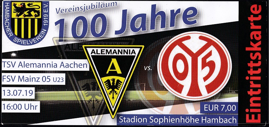 Wie schon 2012 bestritt die Alemannia ein Testspiel im Stadion Sophienhöhe in Hambach. Gegner war die U23 von Mainz, die als 14. der Regionalliga Südwest knapp die Klasse gehalten hatte. Die Alemannia stand in einem ausgeglichenen Spiel stabil, bis Noel Mitte der zweiten Halbzeit eine Flanke von Schmitt zum 1:0 einköpfte. Rüter traf zehn Minuten später mit einem abgefälschten Schuss zum 2:0-Endstand.