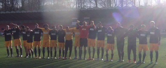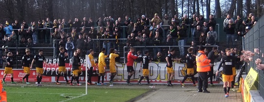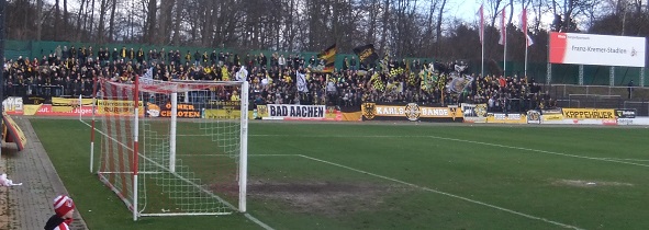 Neben der Fahrt nach Kothausen stand für die Alemannia am Sonntag der zweite hässliche Termin dieser Saison auf dem Programm. Zwischen Gaffel alkoholfrei und schlecht geklauten Hymnen hält sich die Lust auf Fußball in Grenzen, und das Spiel passte sich zunächst dem unschönen Umfeld an. Lejan war nach abgelaufener Sperre wieder dabei, auch Schumacher und Moslehe spielten von Anfang an. Nicht im Kader war u.a. Krasniqi, der im zeitgleichen Spiel der Zweiten gegen die Westwacht zum Einsatz kam. Die Gastgeber machten im ersten Durchgang den etwas gefährlicheren Eindruck. Einmal wurde im Fünfmeterraum trotz Missverständnis glücklich geklärt, dann schoss Laux von links am langen Eck vorbei. Nach einer Stunde kam Dowidat für Moslehe ins Spiel und sorgte direkt für Belebung. Sein Flachschuss nach 65 Minuten ging knapp am rechten Pfosten vorbei. Eine Viertelstunde vor dem Ende schwächten sich die Gastgeber selbst; Golobart sah nach Ellbogenschlag gegen Marquet Gelb-Rot. Zehn Minuten vor Schluss setzte Marquet auf der rechten Seite Ajani in Szene, dessen Querpass Garcia drei Meter vor dem Tor mit der Fußspitze erreichte, aber nicht im Tor unterbringen konnte. Nachdem Spiele in den Schlussminuten allzu oft gegen uns entschieden wurden, lief es diesmal tatsächlich andersrum. Dowidat flankte von links, Marquet lief in den Ball und köpfte perfekt zum 0:1 ins rechte Eck. Das Spiel war nicht überragend, aber die Mannschaft hatte Willen gezeigt und das Siegtor am Ende erzwungen. Entsprechend ausgelassen fiel die Party mit den gut 1000 mitgereisten Fans aus. Der Vorsprung auf den ersten Abstiegsplatz beträgt damit immerhin zehn Punkte.