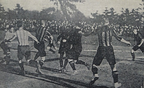 Mittelstürmer aus weitester Entfernung den Ball über den Kopf ins