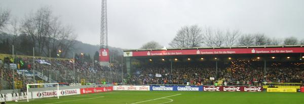 gehen bedröppelt zum Mittelkreis, und die Gästefans jubeln. Wir