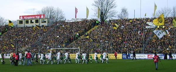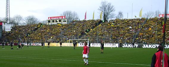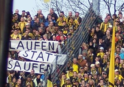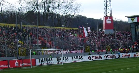 ohne erkennbaren Anlass mit den Fans auf der Überdachten an.