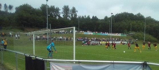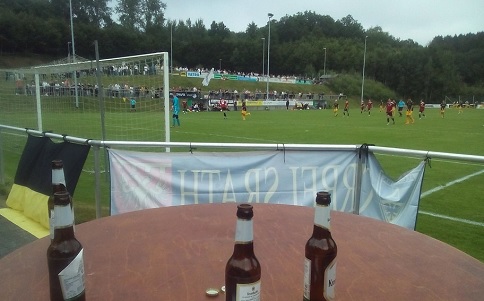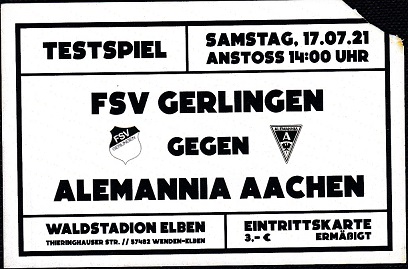 Ihr zweites Vorbereitungsspiel bestritt die Alemannia beim FSV Gerlingen bei Olpe, in der Nähe der Heimat unseres neuen Trainers Patrick Helmes. Da der FSV nur über Kunstrasen verfügt wurde im Nachbardorf auf dem Naturrasen von Grü-Weiß Elben gespielt. 500 Zuschauer waren zugelassen - das erste Spiel seit rund neun Minuten, das Alemannia-Fans live im Stadion sehen durften. Allein das sorgte bei den gut 100 mitgereisten Aachenern für sicht- und hörbare Euphorie, das Spiel tat dann noch sein Übriges. Die Alemannia legte etwas das doppelte Tempo der Vorsaison vor und schoss satte zehn Tore. Wenn auch der Gegner in der Westfalenliga zuletzt am Tabellenende stand und keinen besonders fitten Eindruck machte, sind das nur zwei Ligen unter der Regionalliga. Da schmeckte plötzlich sogar das ortsübliche Krombacher. Wie schon im ersten Spiel wurde zur Halbzeit einmal komplett durchgewechselt, inklusive der A-Jugendlichen Statovci und Kozlyuk. Mit Christian Gartner, der im ersten Spiel pausiert hatte, kam auch der letzte der neun externen Neuzugänge zum Einsatz.