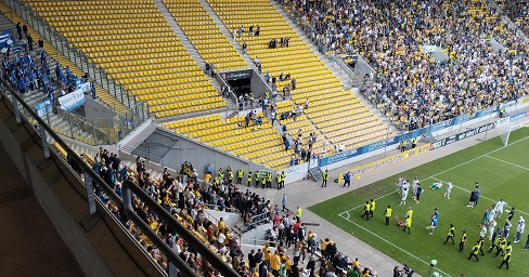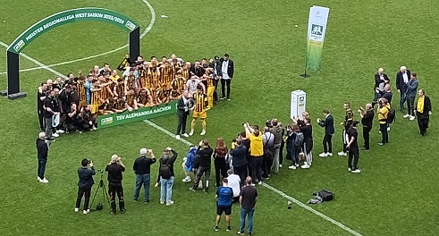 Zum letzten Heimspiel gegen Absteiger Velbert war das Stadion dieses Mal nicht ganz ausverkauft. Töpken traf nach Hereingabe von Bapoh früh zum 1:0. Der größte Teil der restlichen Spielzeit verlief eher belanglos, mit nervigen Pyroeinlagen, Dauergesängen und verschiedenen Torchancen auf beiden Seiten. Kaya sah kurz vor der Pause bei einer unnötigen Rudelbildung die Rote Karte, und Töpken erzielte in der zweiten Halbzeit diesmal nach Hereingabe von Strujic sein zweites Tor. Schließlich gab noch Sascha Marquet fast genau 10 Jahre nach seinem letzten Alemannia-Spiel sein Comeback. Am Ende eines entspannten Tages bekamn unsere Mannschaft von der WDFV-Delegation elf Jahre nach dem Abstieg in die Regionalliga die Meisterschale überreicht.