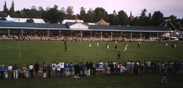 Trabrennbahn mit großer alter Holztribüne und Stehrängen auf