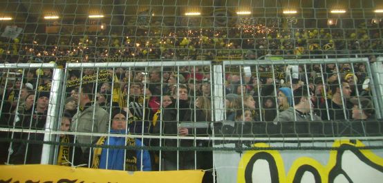* Anpfiff im Nebel vor schneebefreiten, zum zweiten Mal im neuen Stadion ausverkauften Rängen
