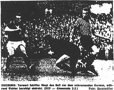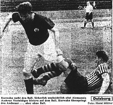 "Beim Einlauf der Mannschaften erscholl Beifall für die Aachener überraschenderweise stärker als für die Platzbesitzer und auch während des gesamten Spieles erwiesen sich die Aachener Schlachtenbummler entschieden aktiver als ihre 'Kontrahenten'."