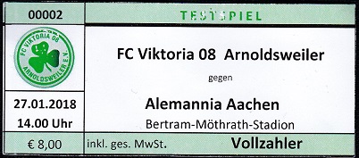 Ihr viertes Vorbereitungsspiel der Winterpause bestritt die Alemannia beim Mittelrheinligisten Viktoria Arnoldsweiler. Dabei kam Testspieler Severin Buchta vom Karlsruher SC über 90 Minuten zuerst auf der rechten, dann auf der linken Seite zum Einsatz. Nach einer Viertelstunde verletzte sich mit Tobias Lippold nach Mohr und Winter der aktuell dritte wichtige Spieler. Azaouaghi brachte die Alemannia nach einem langen Ball von Buchta in Führung. Nach vielen Wechseln auf beiden Seiten kamen die Gastgeber mit den Ex-Alemannen Odagaki und Arslan besser auf, und Terauchi sorgte nach Anspiel von Odagaki für den nicht ganz unverdienten Ausgleich.