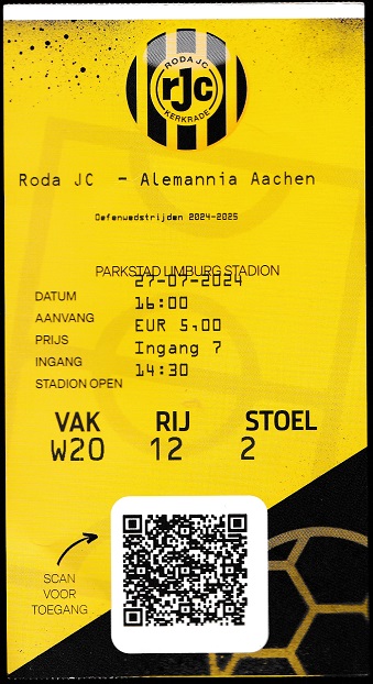 Im vorletzten Vorbereitungs trat die Alemannia im Rahmen der dortigen Saisoneröffnung bei Roda JC Kerkrade an. Bei schlechtem Wetter, schlechter Musik und Schlangen vor den Eingängen war er dort mäßig gemütlich. Auch auf dem Platz lief es zunächst nicht nach Plan; Scepanik (vor Anpfiff), Makanda (7.) und Heister (19.) mussten früh passen. Zauner traf Mitte der ersten Halbzeit zum 1:0 für die Gastgeber. Kurz nach der Pause gelang Strujic nach Hereingabe von Harnafi der Ausgleic. Kongolo traf im Anschluss an einen Eckball zum 2:1-Endstand. Die Alemannia vergab einige Ausgleichschancen, bevor es in der Nachspielzeit unnötig zu einer Rudelbildung und einer überraschenden Roten Karte für Baum für einen angeblichen Ellenbogen bei einem Kopfballduell kam.