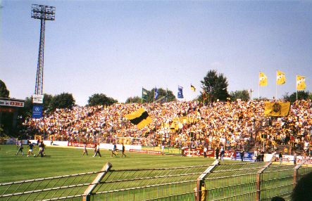 Papptafeln in den drei rechten Blöcken der Sitztribüne verteilt.