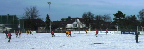 Alemannia II bestritt am Sonntag ein Testspiel beim Aufsteiger und derzeit Dritten der Landesliga Hertha Walheim. Die Walheimer Grenzlandkampfbahn liegt erfreulich weit weg vom Aachener Karneval, aber auch weit genug in der Eifel für eine mittelhohe Schneedecke. Mit Thorsten Stuckmann sowie in der ersten Halbzeit Mirko Casper, Faton Popova und Lubos Pecka kamen vier Profis zum Einsatz. In der Sturmspitze spielte erstmals Neuzugang Rene Lewejohann. Die Alemannia, die das letzte Testspiel in Walheim im Oktober 5:2 gewonnen hatte, tat sich auf dem Schneeboden schwer, ins Spiel zu kommen. Faton Popova mit einem Lattentreffer und einem Freistoß sowie Abdul Özgen, der einen Elfmeter am Tor vorbeischoss, vergaben für die in Schwarz-Rot spielende Alemannia, während auf der Gegenseite Steffen Wiederhold mit einem schönen Heber über Thorsten Stuckmann erfolgreich war. Nach dem Wechsel scheiterten Emil Miljkovic, Abdenour Amachaibou und zweimal Marco Quotschalla am starken Torwart Schmitz, und Quotschalla traf noch einmal die Latte. Stattdessen verwertete Mario Kappes einen Konter zum 2:0, für die Alemannia reichte es trotz am Ende drückender Überlegenheit nur noch zum 2:1 durch Amachaibou. Am Mittwoch um 19 Uhr trifft die Mannschaft von Thomas Hengen in der schneefreien Münzenberg-Kampfbahn auf Borussia Freialdenhoven.