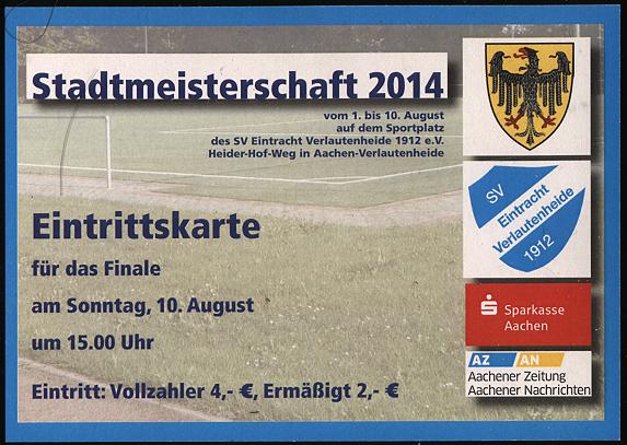 Im Finale der Stadtmeisterschaft traf Alemannia II auf Ligakonkurrent Hertha Walheim. Die Alemannia hatte sich zuvor im Elfmeterschießen gegen Arminia Eilendorf durchgesetzt, die Hertha ihr Halbfinale gegen Inde Hahn mit 2:1 gewonnen. Nach der mäßigen Vorrunde etwas überraschend lag die Alemannia nach einer halben Stunde 3:0 in Führung. Die ersten beiden Tore erzielte der Neuzugang der U19 Maik Ferber jeweils nach Vorarbeit von Tobi Mohr über die linke Seite. Beim dritten Tor enteilte Mohr der aufgerückten Walheimer Abwehr und traf selbst. Zwischen druch hatte Ex-Alemanne Statovci nur den Pfosten getroffen nachdem er Torwart Fukudome umkurvt hatte. Erst ein umstrittener, vom ehemaligen Aachener Domgörgen verwandelter Elfmeter brachte Walheim zurück ins Spiel, zu mehr als dem 3:2 durch Weitz kurz vor Schluss reichte es nicht mehr. Alemannia II gewann damit zum ersten Mal seit sie in diesem Format ausgetragen wird die Stadtmeisterschaft.