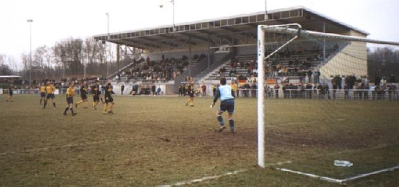 Tribüne, hohen Grashügeln hinter den Toren, zweimal drei Stufen