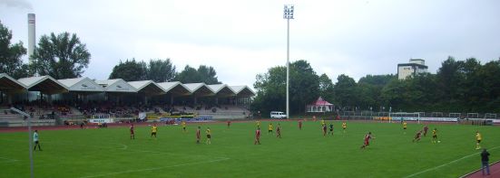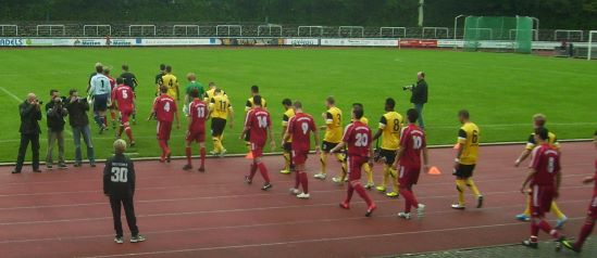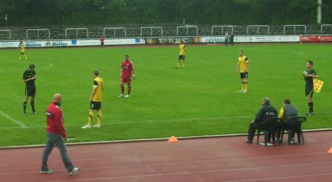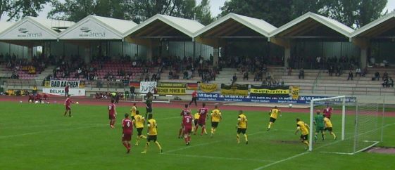 Alemannia-Mannschaft. Nach Flanke von Engelbrecht nahm er den Ball am langen