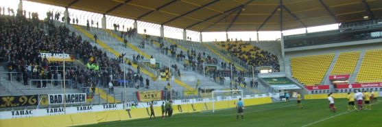 * auf Aachener Seite der "harte Kern" der Fanszene in S3 versammelt