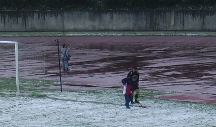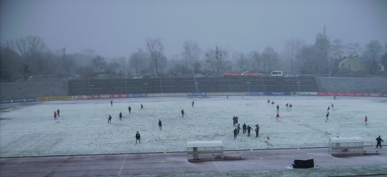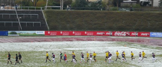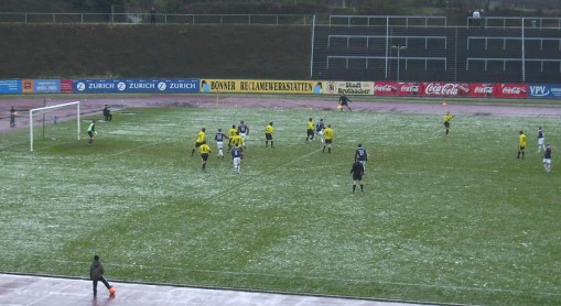 abgesagt, aber in Bonn konnte trotz dichtem Schneetreiben kurz vor Anpfiff