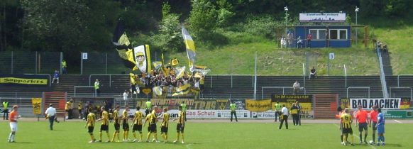 Kaum ist die Saison unserer Profimannschaft endlich vorbei, tritt unsere Zweite in deren Fußstapfen und lässt der besten Saisonleistung gegen Hüls die schlechteste folgen. Während Gastgeber Velbert mit einem Sieg den Klassenerhalt perfekt machen konnte, ging es für die Alemannia um den unbedeutenden fünften Platz. Entsprechend klar waren die Rollen verteilt: Die Mannschaft des Ex-Alemannen Frank Schulz spielte engagiert, und die Schwarz-Gelben nicht. Die Aachener Fans zahlten Eintritt, und die Velberter nicht (ein Sponsor hatte sich spendabel, aber wenig gastfreundlich gezeigt). Auch sonst gab es sowohl Licht als auch Schatten: Die Sonne schien herrlich auf das Stadion zur Sonnenblume, aber das Kuchenbuffet ist nicht mehr das, was es mal war. Man hat mittlerweile Sitze auf die Stufen montiert und überdacht, aber eine Fanszene ist entweder nicht mehr existent oder hatte gerade ihre Jahreshauptversammlung in White Karims Friseursalon. In jedem Fall konnte sich Velbert über den so gut wie kampflos errungenen Klassenerhalt freuen. Vorher geht es zum Saisonabschluss am nächsten Sonntag nach Siegen, und dann hoffentlich nicht ganz so desolat wie heute.
