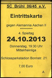 Nach zuletzt zwei Niederlagen musste Alemannia II zum Nachholspiel nach Brühl. Die mit Abel und Schumacher aus der Ersten angetretene Alemannia bot im ersten Durchgang eine schwache Leistung. Kolz nutzte einen Fehler der unkonzentrierten Hintermannschaft zum 1:0. Unsere Mannschaft hatte nach einer halben Stunde durch einen Kopfball von Taher nach Flanke von Schumacher ihre beste Chance. Zur Pause kamen Candela und Büge für Abel und Schumacher, ersterer traf 90 Sekunden nach dem Wechsel mit einem Aufsetzer aus 20 Metern zum 1:1. Die Alemannia hatte jetzt mehr vom Spiel, aber es war Sturmspitze Notz, der eine verlängerte Rechtsflanke zum 2:1 für die Gastgeber nutzte. Statovci hatte aus dem Gewühl die Gelegenheit zum Ausgleich, und Feuerbach lenkte einen Distanzschuss von Wirtz um den Pfosten. Die letzten Minuten gehörten dem durchaus komischen Brühler Trainer mit dem Cölschen Dialekt, der mit Festhalten eines Balles Zeit schinden wollte, umgerempelt wurde, wie ein Käfer zappelnd auf dem Rücken lag und schließlich ein Hütchen nach der Aachener Trainerbank warf. Hut ab. Die Alemannia hat nach drei Niederlagen in Folge eine insgesamt ausgeglichene Bilanz und steht auf dem sechsten Tabellenplatz.