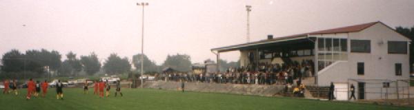 Stehtribüne und Stadionkneipe mit guter Sicht aufs Spielfeld. Bei der