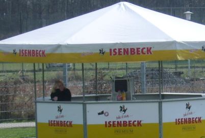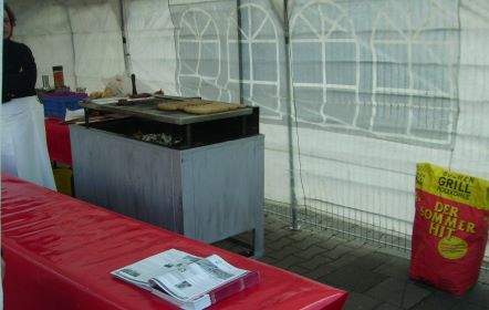 Ordner, zwei Polizisten, einen Getränkestand sowie einen Grill mit zwei