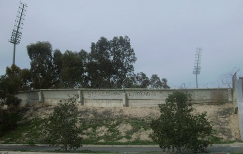 Das Zenon-Stadion, in dem der "Love Cyprus Cup" stattfand. Die einheimischen Fans haben offenbar klare politische Ansichten, müssen aber noch ein wenig an der Rechtschreibung arbeiten.