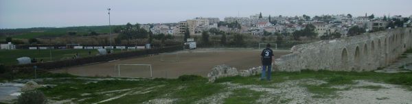Hier spielt ASIL Lyssi (1974 wegen der Teilung Zyperns nach Larnaka umgezogen) gegen Dighenis Morphou in der zweiten Liga. Verbandsligafußball vor wenigen Zuschauern, aber die richtigen Vereinsfarben.