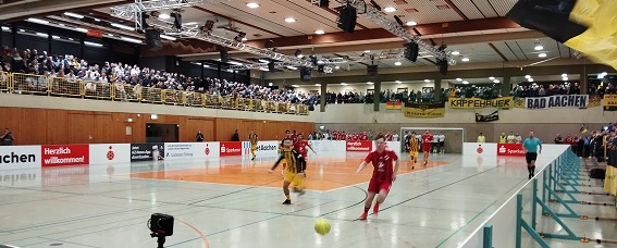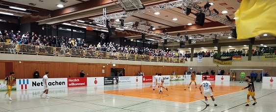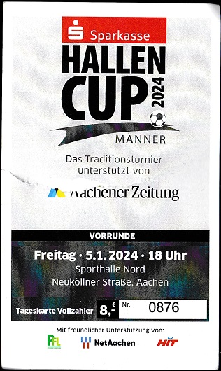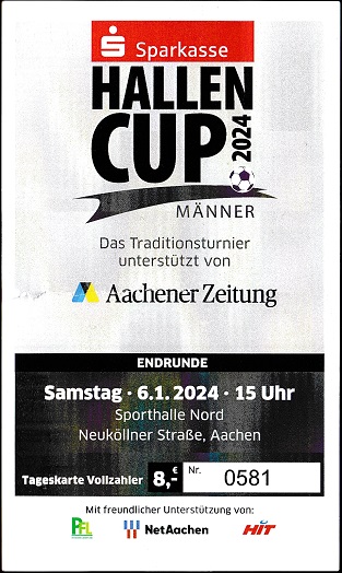 2.-6.1.2024: Hallencup Aachen Spielzeit 2x10 Minuten 1. Vorrunde, 02.01.2024, Erkelenz Gruppe A: Geramnia Teveren SC Erkelenz 1:2 Germania Teveren Spotrfreunde Uevekoven 6:5 Sportfreunde Uevekoven SC Erelenz 3:7 1. SC Erkelenz 6 9: 4 2. Germania Teveren 3 7: 7 3. Sportfreunde Uevekoven 0 8:13 Gruppe B: Union Schafhausen SG Union Würm-Lindern 7:2 SG Union Würm-Lindern SV Helpenstein 2:4 SV Helpenstein Union Schafhausen 3:0 1. SV Helpenstein 6 7: 2 2. Union Schafhausen 3 7: 5 4. SG Union Würm-Lindern 0 4:11 Finale: SC Erkelenz SV Helpenstein 7:4 2. Vorrunde, 03.01.2024, Düren Gruppe C: Sportfreunde Düren TSV Düren 3:4 TSV Düren Rhenania Lohn 4:1 Rhenania Lohn Sportfreunde Düren 6:3 1. TSV Düren 6 8: 4 2. Rhenania Lohn 3 7: 7 3. Sportfreunde Düren 0 6:10 Gruppe D: 1.FC Düren Grün-Weiß Welldorf-Güsten 4:2 Grün-Weiß Welldorf-Güsten Viktoria Arnoldsweiler 3:4 Viktoria Arnoldweiler 1.FC Düren 2:2 1. 1. FC Düren 4 6: 4 2. Viktoria Arnoldsweiler 4 6: 5 3. Grün-Weiß Welldorf-Güsten 0 5: 8 Finale: 1.FC Düren TSV Düren 6:3 3. Vorrunde, 04.01.2024, Neuköllner Straße, Aachen Gruppe E: Teutonia Weiden SV Eilendorf 4:1 SV Eilendorf Kohlscheider BC 7:6 Kohlscheider BC Teutonia Weiden 4:4 1. Teutonia Weiden 4 8: 5 2. SV Eilendorf 3 8:10 3. Kohlscheider BC 1 10:11 Gruppe F: VfL Vichttal Arminia Eilendorf 10:4 Arminia Eilendorf Alemannia Mariadorf 6:3 Alemannia Mariadorf VfL Vichttal 5:9 1. VfL Vichttal 6 19: 9 2. Arminia Eilendorf 3 10:13 3. Alemannia Mariadorf 0 8:15 Finale: Teutonia Weiden VfL Vichttal 1:3 n.V. 4. Vorrunde, 05.01.2024, Neuköllner Straße, Aachen Zuschauer: 1200 (ausverkauft)ALEMANNIA: Strauch, Schmidt - Ametov, Ramaj, Pagliuca, Statovci, Herzog, Abdi, Islamovic, Mirgartz Gruppe G: Eintracht Verlautenheide Rasensport Brand 5:1 Rasensport Brand SG Stolberg 5:5 SG Stolberg Eintracht Verlautenheide 2:7 1. Eintracht Verlautenheide 6 12: 3 2. Rasensport Brand 1 6:10 3. SG Stolberg 1 7:12 Gruppe H: ALEMANNIA SV Rott 5:2 1:0 Ametov (8.), 2:0 Ramaj (11.), 2:1 Hess (12.), 3:1 Ramaj (14.), 4:1 Ramaj (15.), 5:1 Mirgartz (18.), 5:2 Gruhn (20.) SV Rott SV Breinig Breinigerberg 2:2 SV Breinig Breinigerberg ALEMANNIA 1:4 0:1 Pagliuca (4.), 1:1 Standop (5.), 1:2 Pagliuca (11.), 1:3 Mirgartz (12.), 1:4 Statovci (14.) 1. ALEMANNIA 6 9: 3 2. SV Rott 1 4: 7 3. SV Breinig Breinigerberg 1 3: 6 Finale: Eintracht Verlautenheide ALEMANNIA 4:3 n.V. 1:0 Diki (4.), 1:1 Statovci (9.), 1:2 Mirgartz (12.), 2:2 Ruegenberg (19.), 3:2 Lobanov (21.), 4:2 Ruegenberg (24.), 4:3 Statovci (25.) Endrunde, 06.01.2024, Neuköllner Straße, Aachen Zuschauer: 1000